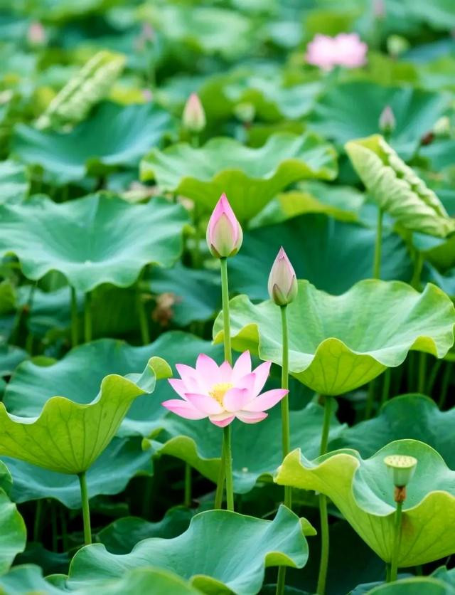 我驻足于荷塘之畔,我被这密密麻麻的荷叶所吸引,它们有的大如圆盘有的小似翠钱,错落有致地铺展在眼前,仿佛置身于一片绿色的海洋之中,那绵延不绝的绿意,如同轻柔的手,轻轻抚摸着炎炎夏日的燥热,将清凉的感觉瞬间传递至心间。