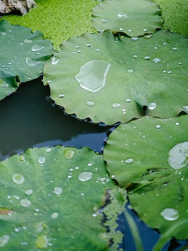 微风拂过,荷叶翻涌,露珠在叶面上跳跃,在晨光的折射下,耀眼的光芒。时不时有鱼儿跳出水面,搅得水珠到荷叶上,如同晶莹的珍珠在玉盘上滚来滚去,一不小心便跌入水中,漾起一圈圈小小的涟漪。